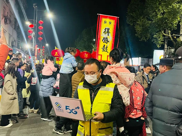 2月1日,“中國(guó)狀元縣”——休寧縣隆重開(kāi)展“鼓迎新春龍騰狀元城”傳統(tǒng)民俗表演活動(dòng),華燈璀璨、張燈結(jié)彩、人頭攢動(dòng)、熱鬧非凡,游客和村民前來(lái)感受非遺傳統(tǒng)文化。為保障活動(dòng)期間通信暢通,安徽移動(dòng)休寧分公司組織志愿服務(wù)小分隊(duì),對(duì)狀元古城實(shí)現(xiàn)5G全覆蓋,提前對(duì)狀元街、狀元博物館等活動(dòng)周邊區(qū)域進(jìn)行多輪測(cè)試和設(shè)備巡檢,對(duì)4G/5G網(wǎng)絡(luò)進(jìn)行擴(kuò)容,進(jìn)行現(xiàn)場(chǎng)網(wǎng)絡(luò)保障。
