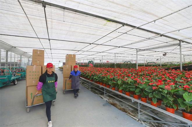 彭澤縣蔓谷田園綜合體大棚內(nèi)各式花卉擺放整齊,工人正在打理。
