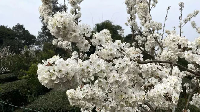 在鶴山街道櫻桃山景區(qū),1.2萬畝如云似雪的櫻桃花鋪滿山間,白綠交融的爛漫花海蔚為壯觀。春風拂過,花瓣輕揚如雨、春意爛漫,一幅美麗的春日畫卷徐徐展開,無數游客慕名而來,讓人流連忘返。賞櫻桃花、聞花香,游客沉醉在迷人的花海里,感受愜意的春日美景。