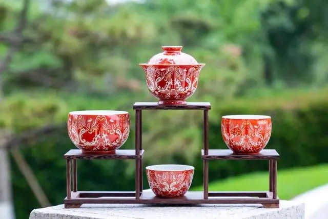 其中,粉彩錯金銀虎嘯鳳吟系列,是一件不可多得的佳器名品。整套茶具紋飾以館藏文物唐代金鳳飾件為設計靈感。金鳳雙翅展開,兩足蹬地,振翅欲飛的姿態(tài)生動逼真。在中國古代傳統(tǒng)文化中,鳳凰被視為瑞鳥,是鳥中之王。通過對金鳳飾件進行提取,設計出鸞鳥紋,鳳紋羽翼展開可合為院徽圖形,整體構成虎頭紋。茶具沿用藝林堂的粉彩工藝,采用錯金銀的呈現(xiàn)效果,不僅讓這只“鳳”更有“活性”,也讓器物更有精細感,正紅的底色也呈現(xiàn)出“紫禁紅”“中國紅”的極佳效果,在保留和傳播傳統(tǒng)文化的同時,也符合當下的審美需求。