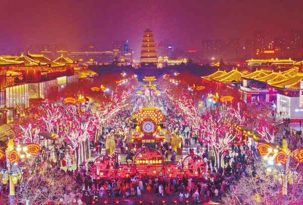 大唐不夜城有多火?今年春節(jié)期間,因客流、車流飽和,街區(qū)不得不取消或調(diào)整街區(qū)演出時間,將演出場地“省下來”給游客。春節(jié)假期街區(qū)日均游客量達(dá)65萬人次。