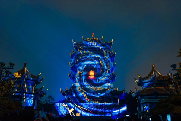 《夜上黃鶴樓》是由武漢市園林和林業(yè)局、武漢文旅集團聯(lián)合黃鶴樓公園共同打造,集實景化、行浸式、體驗型于一體的文化旅游演藝。這一項目通過激光投影、激光動畫、高壓水霧等高科技光影技術,融入藝術表演方式,打造武漢市地標夜游新體驗。