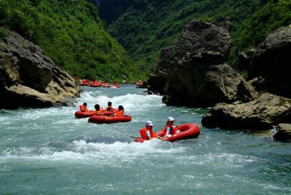 毗鄰的務(wù)川自治縣豐樂鎮(zhèn),洪渡河漂流的熱度隨著氣溫的升高,呈現(xiàn)火熱態(tài)勢,一艘艘皮劃艇順流而下,游客們的歡呼聲和尖叫聲此起彼伏。