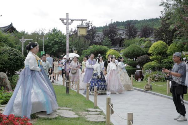 走進延吉中國朝鮮族民俗園,隨處可見身著朝鮮族服飾的游客,穿梭于青瓦白墻的院落里,抬眸揮手間皆是風(fēng)景。在民俗園里當一天“公主”,在延吉網(wǎng)紅彈幕墻前,手持一杯印有“延吉”字樣的咖啡拍一張照片已經(jīng)成為一種時尚。