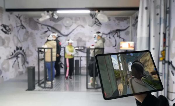 這一體驗(yàn)并非孤例。在上海自然博物館,《又見(jiàn)恐龍》XR嘉年華自2024年12月開(kāi)放以來(lái)持續(xù)火爆。觀眾佩戴XR眼鏡后,便由NPC科考隊(duì)員“呂小土”引導(dǎo),乘“時(shí)光電梯”穿越至中生代。他們?cè)庥銮还驱?、協(xié)助腕龍寶寶逃離異特龍追擊,六軸動(dòng)感平臺(tái)實(shí)時(shí)模擬的撞擊感與失重感,讓白堊紀(jì)的自然奇觀變得可觸可感。