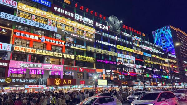深夜十一點(diǎn),延邊大學(xué)“網(wǎng)紅彈幕墻”前依然人頭攢動(dòng),游客們舉著印有“延吉”字樣的咖啡杯拍照打卡,打糕、冷面、米腸等特色美食香氣四溢,這座東北邊境小城的夜,剛剛開始。
